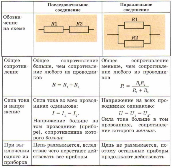 Вопросы и заданияПервый уровень 1. Чему равно общее сопротивление двух последовательно соединённых резисторов сопротивлениями 1 и 2 Ом? 2. Изобразите схему последовательного соединения трёх резисторов. 3. 100 одинаковых резисторов сопротивлением 2 Ом каждый соединены последовательно. Чему равно их общее сопротивление? 4. Чему равно общее сопротивление двух параллельно соединённых резисторов сопротивлениями 1 и 2 Ом? 5. Изобразите схему параллельного соединения трёх резисторов. 6. 100 одинаковых резисторов сопротивлением 2 Ом каждый соединены параллельно. Чему равно их общее сопротивление? 7. Сопротивление одного из резисторов 2 Ом, а другого — 3 Ом. Их общее сопротивление больше 3 Ом. Как соединены резисторы — последовательно или параллельно? 8. Сопротивление одного из резисторов 2 Ом, а другого — 3 Ом. Их общее сопротивление меньше 2 Ом. Как соединены резисторы — последовательно или параллельно? 9. Как соединены электроприборы в квартире — последовательно или параллельно? Каково напряжение в каждой розетке? Опасно ли оно для жизни? 10. Что такое реостат? Для чего используют реостаты? Второй уровень 11. К цепи, состоящей из нескольких последовательно соединённых резисторов, подключили последовательно резистор сопротивлением 3 Ом. Как изменилось общее сопротивление цепи? 12. К цепи, состоящей из нескольких параллельно соединённых резисторов, подключили параллельно резистор сопротивлением 3 Ом. Может ли после этого общее сопротивление цепи стать равным 5 Ом? 13. Составьте задачу по теме «Последовательное и параллельное соединения проводников», ответом которой было бы «12 Ом». Домашняя лабораторияСоставьте электрическую цепь из батарейки и двух лампочек, соединенных один раз последовательно, а другой раз — параллельно. Какие отличия вы заметили? Как вы их объясните?