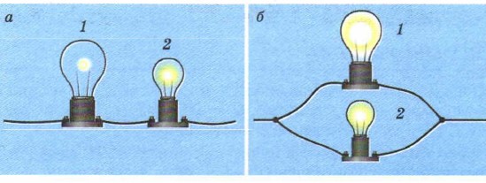 Рис. 15.4. Последовательное и параллельное соединение ламп с разным сопротивлением Соединим теперь лампы параллельно (рис. 15.4 б). Мы увидим, что лампы «поменялись ролями»: теперь ярче светит та лампа, у которой сопротивление меньше. Значит, при параллельном соединении двух проводников мощность тока больше в том проводнике, который имеет меньшее сопротивление. Объясним теперь эти опыты. Обозначим сопротивление лампы с бо́льшим сопротивлением R1 а сопротивление лампы с меньшим сопротивлением R2. При последовательном соединении ламп сила тока в них одинакова. Поэтому для сравнения мощности тока в лампах удобно воспользоваться формулой Р = I2R. Получаем, что мощность тока в лампах Р1 = I2R1, Р2 = I2R2. Из этих формул следует, что