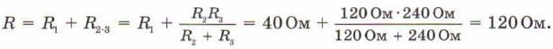 § 16. Примеры расчёта электрических цепей Электрические цепи с последовательным и параллельным соединениями проводниковРассмотрим на примере, как найти сопротивление электрической цепи, в которой есть как последовательно, так и параллельно соединённые резисторы. РЕШИМ ЗАДАЧУ 1. Определите сопротивление участка электрической цепи, схема которой приведена на рис. 16.1. Сопротивления резисторов R1 = 40 Ом, R2 = 120 Ом и R3 = 240 Ом.