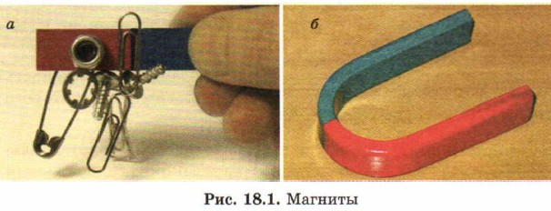 § 18. Магнитные взаимодействия Взаимодействие постоянных магнитовМагниты, как вы знаете, притягивают железные и стальные предметы. На рис. 18.1, а изображён полосовой магнит, а на рис. 18.1, б — дугообразный.