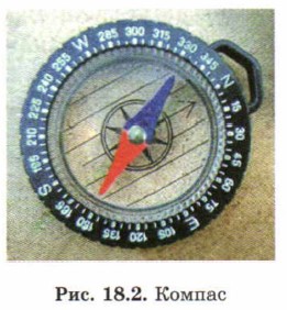 У каждого из этих магнитов есть два полюса — так называют части магнита, вблизи которых магнитное действие проявляется наиболее сильно. Бывают магниты и с большим числом полюсов, чем два. Но магнитов с одним полюсом нет! Скоро мы узнаем, с чем это связано. Если подвесить полосовой магнит на нити, он повернётся и одним полюсом будет указывать на север — этот полюс магнита называют северным. Другой полюс магнита называют южным. Северный полюс магнита окрашивают синим и обозначают1 N, а южный — окрашивают красным и обозначают S. Стрелка компаса (рис. 18.2) — это маленький полосовой магнит. 1 Такие обозначения полюсов магнита связаны с тем, что во многих европейских языках (например, английском), слово «север» начинается с буквы N (north), а «юг» — с буквы S (south).