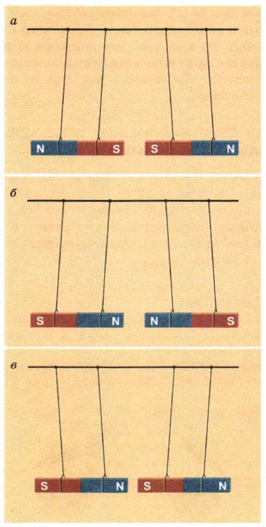 Постоянные магниты взаимодействуют друг с другом. Причём это взаимодействие напоминает взаимодействие электрических зарядов: одноимённые полюса магнитов отталкиваются (рис. 18.3, а, б), а разноимённые — притягиваются (рис. 18.3, в).