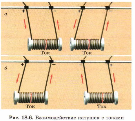 § 18. Магнитные взаимодействия Взаимодействие между проводниками с токами и магнитами (окончание)Заменив прямолинейные проводники катушками с током, Ампер обнаружил, что их магнитное действие похоже на магнитное действие полосовых магнитов. Убедимся в этом и мы. ПОСТАВИМ ОПЫТ Торцы катушек притягиваются или отталкиваются в зависимости от того, как направлены токи в катушках (рис. 18.6).