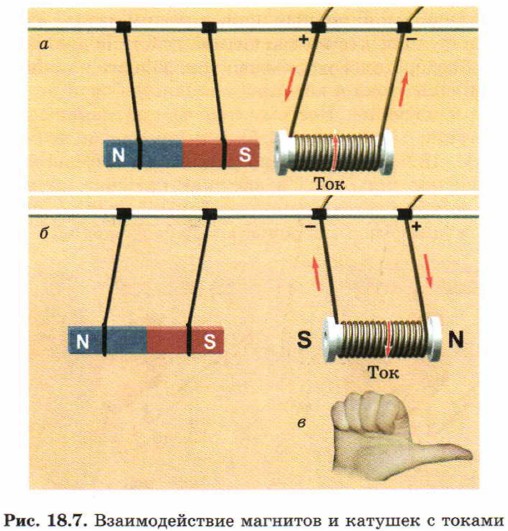 Чтобы убедиться, что взаимодействие катушек, по которым текут токи, действительно магнитное, заменим одну из катушек полосовым магнитом (рис. 18.7). Мы видим, что торцы катушек, по которым текут токи, проявляют себя как полюса магнита. Чтобы определить, какой торец катушки с током является её северным магнитным полюсом, можно воспользоваться правилом правой руки. Его формулируют так: