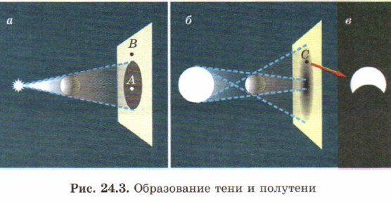 Почему же в первом случае образуется тень с резкими краями, а во втором — тень и полутень? Дело в том, что при освещении шара точечным источником свет от источника в точку А совсем не попадает, поэтому здесь область тени (см. рис. 24.3, а). В точку В попадает свет от всего источника. При освещении шара протяжённым источником полутень будет на экране в тех точках, из которых протяжённый источник света виден частично (см. рис. 24.3, б). Для примера на рис. 24.3, в показано, каким видится светящийся плафон из точки С, которая находится в области полутени. Освещение можно устроить так, что теней не будет совсем — будут только полутени (см. пункт «При каком освещении нет теней?»).