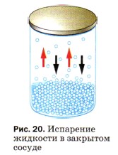 Так как некоторое число быстро движущихся молекул всегда имеется в жидкости, то испарение должно происходить при любой температуре. Наблюдения подтверждают это. Например, лужи, образовавшиеся после дождя, высыхают и летом в жару, и осенью, когда уже холодно. Но летом они высыхают быстрее. Дело в том, что чем выше температура жидкости, тем больше в ней быстро движущихся молекул. Они способны преодолеть силы притяжения окружающих молекул и вылететь с поверхности жидкости. Поэтому испарение происходит тем быстрее, чем выше температура жидкости. Если в узкий и широкий сосуды налить по одинаковому объёму воды, то можно заметить, что в широком сосуде вода испарится значительно быстрее. Например, вода, налитая в блюдце, испаряется быстрее, чем вода, налитая в стакан. Развешанное бельё быстрее высыхает, чем скомканное. Это объясняется тем, что жидкость испаряется с поверхности, и чем больше площадь поверхности жидкости, тем большее число молекул одновременно вылетает в воздух. Значит, скорость испарения жидкости зависит от площади её поверхности. Одновременно с переходом молекул из жидкости в пар происходит и обратный процесс. Беспорядочно двигаясь над поверхностью жидкости, часть молекул, покинувших её, снова возвращается в жидкость. Если испарение жидкости происходит в закрытом сосуде, то вначале число молекул, вылетевших из жидкости, будет больше числа молекул, возвратившихся обратно в жидкость. Поэтому плотность пара в сосуде будет постепенно увеличиваться. С увеличением плотности пара увеличится и число молекул, возвращающихся в жидкость. Довольно скоро число молекул, вылетающих из жидкости, станет равным числу молекул пара, возвращающихся обратно в жидкость. С этого момента число молекул пара над жидкостью будет постоянным. Наступает так называемое динамическое равновесие между паром и жидкостью.