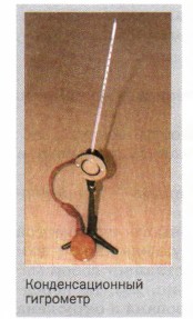 По термометру замечают температуру, при которой они появляются. Это и есть точка росы, так как появление росы говорит о том, что пар стал насыщенным. По таблице плотности насыщенного водяного пара и определяют абсолютную влажность воздуха. Действие волосного гигрометра (рис. 24) основано на свойстве человеческого волоса удлиняться при увеличении относительной влажности воздуха. При увеличении влажности воздуха длина волоса увеличивается, а при уменьшении влажности его длина уменьшается. При этом стрелка, перемещаясь по шкале, указывает относительную влажность воздуха. Прибор для определения влажности воздуха — психрометр — состоит из двух термометров, один из которых обмотан тканью, конец которой опущен в воду. Поскольку вода испаряется, то термометр охлаждается.