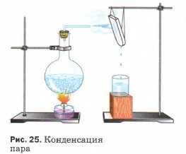 Соприкасаясь с холодным предметом, водяной пар конденсируется (рис. 25). При этом выделяется энергия, поглощённая при образовании пара. Точные опыты показывают, что, конденсируясь, пар отдаёт то количество энергии, которое пошло на его образование.
