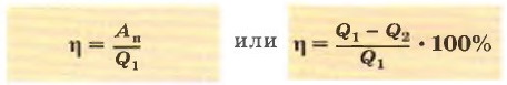 Глава 1. Тепловые явления § 24. КПД теплового двигателяЛюбой тепловой двигатель превращает в механическую энергию только незначительную часть энергии, которая выделяется топливом. Большая часть энергии топлива не используется полезно, а теряется в окружающем пространстве. Тепловой двигатель состоит из нагревателя, рабочего тела и холодильника. Газ или пар, который является рабочим телом, получает от нагревателя некоторое количество теплоты. Рабочее тело, нагреваясь, расширяется и совершает работу за счёт своей внутренней энергии. Часть энергии передаётся атмосфере — холодильнику — вместе с отработанным паром или выхлопными газами. Очень важно знать, какую часть энергии, выделяемой топливом, тепловой двигатель превращает в полезную работу. Чем больше эта часть энергии, тем двигатель экономичнее. Для характеристики экономичности различных двигателей введено понятие коэффициента полезного действия двигателя — КПД. Отношение совершённой полезной работы двигателя к энергии, полученной от нагревателя, называют коэффициентом полезного действия теплового двигателя.Коэффициент полезного действия обозначают η (греч. буква «эта»). КПД теплового двигателя определяют по формуле