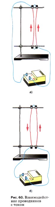 На Международной конференции по мерам и весам в 1948 г. было решено в основу определения единицы силы тока положить явление взаимодействия двух проводников с током. Ознакомимся сначала с этим явлением на опыте. На рисунке 60 изображены два гибких прямых проводника, расположенных параллельно друг другу. Оба проводника подсоединены к источнику тока. При замыкании цепи по проводникам протекает ток, вследствие чего они взаимодействуют — притягиваются или отталкиваются, в зависимости от направления токов в них. Силу взаимодействия проводников с током можно измерить. Эта сила, как показывают расчёты и опыты, зависит от длины проводников, расстояния между ними, среды, в которой находятся проводники, и, что самое важное для нас, от силы тока в проводниках. Если одинаковы все условия, кроме силы токов, то, чем больше сила тока в каждом проводнике, тем с большей силой они взаимодействуют между собой. Представим теперь себе, что взяты очень тонкие и очень длинные параллельные проводники. Расстояние между ними 1 м, и находятся они в вакууме. Сила тока в них одинакова. За единицу силы тока принимают силу тока, при которой отрезки таких параллельных проводников длиной 1 м взаимодействуют с силой 2 • 10-7 Н (0,0000002 Н). Эту единицу силы тока называют ампером (А). Так она названа в честь французского учёного Андре Ампера. Применяют также дольные и кратные единицы силы тока: миллиампер (мА), микроампер (мкА), килоампер (кА). 1 мА = 0,001 А;
