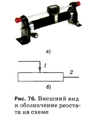 1. На рисунке 77 изображён реостат, с помощью которого можно менять сопротивление в цепи не плавно, а ступенями — скачками. Рассмотрите рисунок и по нему опишите, как действует такой реостат.
