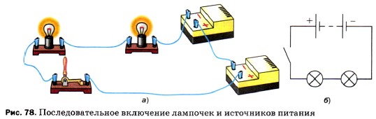 Глава 2. Электрические явления § 48. Последовательное соединение проводниковЭлектрические цепи, с которыми приходится иметь дело на практике, обычно состоят не из одного приёмника электрического тока, а из нескольких различных, которые могут быть соединены между собой по-разному. Зная сопротивление каждого и способ их соединения, можно рассчитать общее сопротивление цепи. На рисунке 78, а изображена цепь последовательного соединения двух электрических ламп, а на рисунке 78, б — схема такого соединения. Если выключать одну лампу, то цепь разомкнётся и другая лампа погаснет.