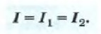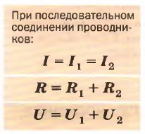 Последовательно соединены, например, аккумулятор, лампа, два амперметра и ключ в цепи, изображённой на рисунке 62 (см. § 38). Мы уже знаем, что при последовательном соединении сила тока в любых частях цепи одна и та же, т. е.