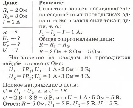 Это равенство вытекает из закона сохранения энергии. Электрическое напряжение на участке цепи измеряется работой электрического тока, совершающейся при прохождении по участку цепи электрического заряда в 1 Кл. Эта работа совершается за счёт энергии электрического поля, и энергия, израсходованная на всём участке цепи, равна сумме энергий, которые расходуются на отдельных проводниках, составляющих участок этой цепи. Все приведённые закономерности справедливы для любого числа последовательно соединённых проводников. П р и м е р 1. Два проводника сопротивлением R 1 = 2 Ом, R 2 = 3 Ом соединены последовательно. Сила тока в цепи I = 1 А. Определить сопротивление цепи, напряжение на каждом проводнике и полное напряжение всего участка цепи. Запишем условие задачи и решим её.