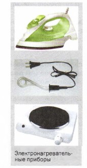 Энергосберегающая лампочка состоит из колбы, наполненной парами ртути и аргона, и пускорегулирующего устройства. На внутреннюю поверхность колбы нанесено специальное вещество — люминофор, которое при воздействии ультрафиолетового излучения испускает видимый свет. В светодиодных лампах электрический ток пропускают не по нити накала, а через миниатюрное электронное устройство (ЧИП — от англ, chip — миниатюрный), нанесённое на полупроводниковый кристалл. При прохождении электрического тока светодиод испускает свет. В последние годы светодиодные лампы находят применение при освещении помещений, их устанавливают в светофорах, фарах автомобилей. Светодиоды используют как индикаторы включения на панелях приборов, цифровых и буквенных табло, подсветке мобильных телефонов, мониторов и др. Тепловое действие тока используют в различных электронагревательных приборах и установках. В домашних условиях широко применяют электрические плиты, утюги, чайники, кипятильники. В промышленности тепловое действие тока используют для выплавки специальных сортов стали и многих других металлов, для электросварки. В сельском хозяйстве с помощью электрического тока обогревают теплицы, кормозапарники, инкубаторы, сушат зерно, приготовляют силос.