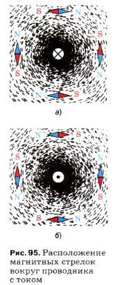В магнитном поле опилки — маленькие кусочки железа — намагничиваются и становятся магнитными стрелочками. Ось каждой стрелочки в магнитном поле устанавливается вдоль направления действия сил магнитного поля. На рисунке 94 изображена картина магнитного поля прямого проводника с током. Для получения такой картины прямой проводник пропускают сквозь лист картона. На картон насыпают тонкий слой железных опилок, включают ток и опилки слегка встряхивают. Под действием магнитного поля тока железные опилки располагаются вокруг проводника не беспорядочно, а по концентрическим окружностям.