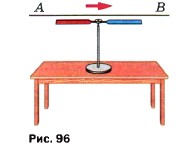 1. Каким полюсом повернётся к наблюдателю магнитная стрелка, если ток в проводнике направлен от А к В (рис. 96)? Изменится ли ответ, если стрелку поместить над проводом? 2. В стене проложен (замурован) прямой электрический провод. Как найти место нахождения провода и направление тока в нём, не вскрывая стену?
