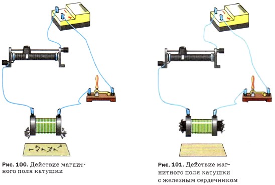 Включим в цепь, содержащую катушку, реостат (рис. 100) и при помощи него будем изменять силу тока в катушке. При увеличении силы тока действие магнитного поля катушки с током усиливается, при уменьшении — ослабляется. Оказывается также, что магнитное действие катушки с током можно значительно усилить, не меняя число её витков и силу тока в ней. Для этого надо ввести внутрь катушки железный стержень (сердечник). Железо, введённое внутрь катушки, усиливает магнитное действие катушки (рис. 101).