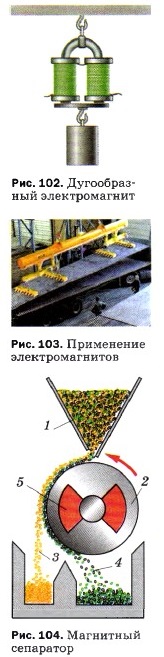 Электромагнит — одна из основных деталей многих технических приборов. На рисунке 102 изображён дугообразный электромагнит, удерживающий якорь (железную пластинку) с подвешенным грузом. Электромагниты широко применяют в технике благодаря их замечательным свойствам. Они быстро размагничиваются при выключении тока, в зависимости от назначения их можно изготавливать самых различных размеров, во время работы электромагнита можно регулировать его магнитное действие, меняя силу тока в катушке. Электромагниты, обладающие большой подъёмной силой, используют на заводах для переноски изделий из стали или чугуна, а также стальных и чугунных стружек, слитков (рис. 103). На рисунке 104 показан в разрезе магнитный сепаратор для зерна. В зерно подмешивают очень мелкие железные опилки. Эти опилки не прилипают к гладким зёрнам полезных злаков, но прилипают к зёрнам сорняков. Зёрна 1 высыпаются из бункера на вращающийся барабан 2. Внутри барабана находится сильный электромагнит 5. Притягивая железные частицы 4, он извлекает зёрна сорняков из потока зерна 3 и таким путём очищает зерно от сорняков и случайно попавших железных предметов. Применяются электромагниты в телеграфном, телефонном аппаратах и во многих других устройствах. Вопросы1. В каком направлении устанавливается катушка с током, подвешенная на длинных тонких проводниках? Какое сходство имеется у неё с магнитной стрелкой?