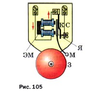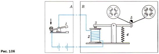 1. На рисунке 105 дана схема устройства электрического звонка. На ней буквами обозначено: ЭМ — дугообразный электромагнит, Я — железная пластинка — якорь, М — молоточек, 3 — звонковая чаша, К — контактная пружина, касающаяся винта С. Рассмотрите схему звонка и объясните, как он действует. 2. На рисунке 106 показана схема простейшей телеграфной установки, позволяющей передавать телеграммы со станции А на станцию В. На схеме цифрами обозначено: 1 — ключ, 2 — электромагнит, 3 — якорь, 4 — пружина, 5 — колёсико, смазанное краской. По схеме объясните работу установки.