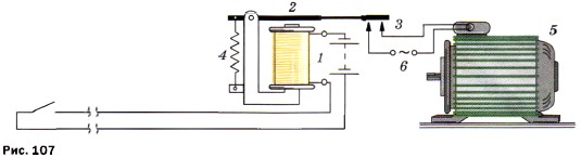 Это очень неудобно, особенно если потребитель тока находится на большом расстоянии от пульта управления, где включается ток. Такие цепи можно включать при помощи специального устройства — электромагнитного реле (рис. 107), приводя его в действие малой силой тока. На схеме обозначено: 1 — электромагнит, 2 — якорь, 3 — контакты рабочей цепи, 4 — пружина, 5 — электродвигатель, 6 — контакты цепи электродвигателя. Объясните, как действует этот прибор.