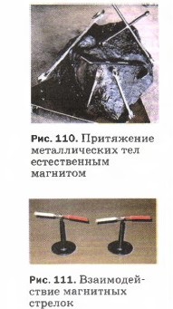 Поднося магнит к предметам, изготовленным из различных материалов, можно установить, что магнитом притягиваются очень немногие из них. Хорошо притягиваются магнитом чугун, сталь, железо и некоторые сплавы, значительно слабее никель и кобальт. В природе встречаются естественные магниты (рис. 110) — железная руда (так называемый магнитный железняк). Богатые залежи магнитного железняка имеются на Урале, в Карелии, Курской области и во многих других местах. Железо, сталь, никель, кобальт и некоторые другие сплавы в присутствии магнитного железняка приобретают магнитные свойства. Магнитный железняк позволил людям впервые ознакомиться с магнитными свойствами тел. Перечислим основные из этих свойств. Если магнитную стрелку приблизить к другой такой же стрелке, то они повернутся и установятся друг против друга противоположными полюсами (рис. 111). Так же взаимодействует стрелка и с любым магнитом.