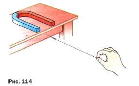 1. Дугообразный магнит поднесите к листу картона. Магнит не притянет его. Затем положите картон на мелкие гвозди и снова поднесите магнит. Лист картона поднимется, а за ним и гвозди. Объясните явление. 2. Положите дугообразный магнит на край стола. Тонкую иглу с ниткой положите на один из полюсов магнита. Затем осторожно потяните иглу за нить, пока игла не соскочит с полюса магнита. Игла зависает в воздухе (рис. 114). Объясните явление.
