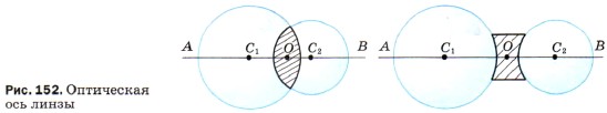 Линзы бывают двух видов — выпуклые и вогнутые. Линза, у которой края намного тоньше, чем середина, является выпуклой (рис. 151, а). Линза, у которой края толще, чем середина, является вогнутой (рис. 151, б).
