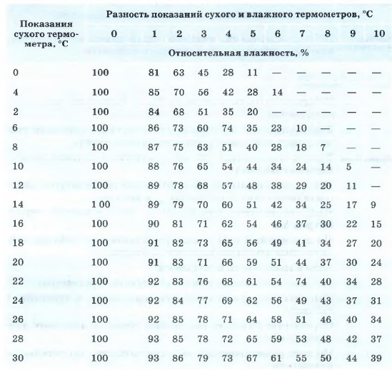 Лабораторная работа № 3 Измерение влажности воздухаЦель работы Измерить влажность воздуха. Приборы и материалы Психрометр или термометр, стакан. Указания к работеЕсли в классе нет психрометра 1. С помощью лабораторного термометра определите температуру воздуха в классе. Результаты измерений запишите в таблицу. 2. Резервуар этого же термометра обмотайте кусочком ткани, конец которой опустите в стакан с водой. П р и м е ч а н и е. Температура воды в стакане и воздуха в комнате должна быть одинаковой. 3. Как только прекратится понижение температуры, запишите показания термометра tвл в таблицу. 4. Найдите разность показаний сухого и влажного термометров Δt. 5. По значениям t и Δt по психрометрической таблице найдите относительную влажность воздуха φ. Если в классе есть психрометр 1. Запишите в таблицу показания сухого термометра. 2. Снимите показания влажного термометра и запишите в таблицу. 3. Определите разность показаний сухого и влажного термометров Δt. 4. По психрометрической таблице найдите относительную влажность φ.