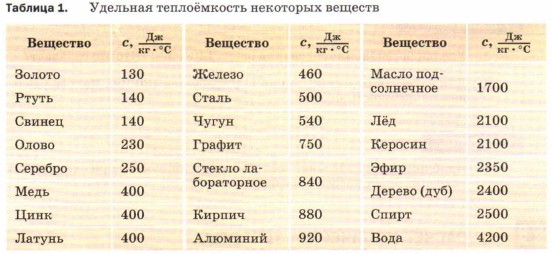 Мы узнали, от каких величин зависит количество теплоты и каковы единицы его измерения. Нам известно, что для нагревания тел одинаковой массы, взятых при одинаковой температуре, на одну и ту же величину требуется разное количество теплоты. Так, для нагревания 1 кг воды на 1 °С требуется количество теплоты, равное 4200 Дж. Если нагревать 1 кг серебра на 1 °С, то потребуется 250 Дж.