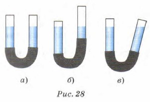 Наклоним правую трубку, оставив левую в вертикальном положении (рис. 28, в). Вода в правой трубке установится горизонтально и уровни воды в трубках останутся одинаковыми. Если трубки заполнить другой жидкостью, например маслом, керосином или ртутью, то всё равно уровни жидкости в трубках будут одинаковы.