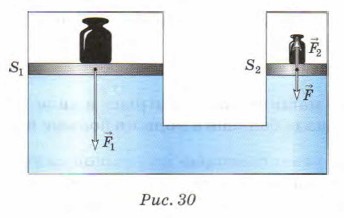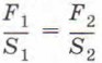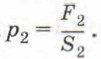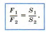 Давление р1 передаётся жидкости, находящейся под большим поршнем. Согласно закону Паскаля, давление, производимое на жидкость или газ, передаётся по всем направлениям без изменения. Следовательно, давление будет передаваться жидкости, находящейся под малым поршнем площадью S2, и на него со стороны жидкости будет действовать давление р2 = p1 Соответственно на малый поршень со стороны жидкости будет действовать сила F2 = p2S2, направленная вверх. Откуда Чтобы жидкость и поршни находились в равновесии, на малый поршень следует подействовать силой F, равной по модулю силе F2 и направленной вертикально вниз. Для этого можно, например, положить на поршень груз. Так как р1 = р2, то