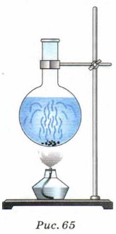 1. Как вы знаете, газы и жидкости обладают плохой теплопроводностью. Возникает вопрос: почему же нагревается воздух от батарей водяного отопления, почему нагревается вода в кастрюле, поставленной на включённую плиту? Чтобы на него ответить, проделаем опыт. Нальём в колбу воду и аккуратно опустим на дно несколько кристалликов марганцовки (рис. 65). Будем нагревать колбу снизу так, чтобы пламя касалось её в том месте, где лежат кристаллики. Можно заметить, что со дна колбы будут подниматься окрашенные струйки воды. Достигнув верхних слоёв воды, эти струйки начнут опускаться.