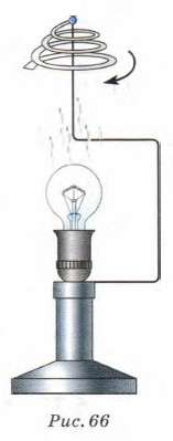 2. Подобным образом осуществляется теплопередача и в газах. Сделаем из бумаги вертушку и поместим её над электрической лампочкой, включённой в сеть (рис. 66). Вертушка начнёт вращаться. Это происходит потому, что нагретые от лампочки менее плотные слои воздуха под действием архимедовой силы поднимаются вверх, а более холодные опускаются вниз и занимают их место. Поднимающиеся слои нагретого воздуха и приводят к вращению вертушки. В проведённых опытах мы наблюдали ещё один вид теплопередачи — конвекцию.