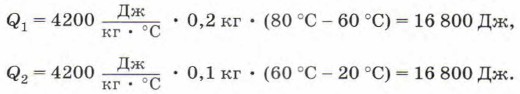 Глава 3. Тепловые явления, газов и твёрдых тел Количество теплоты. Удельная теплоёмкость вещества4. Решение задачи в общем виде: Количество теплоты, отданное горячей водой, вычисляется по формуле Q1 = c1m1(t1 - t). Количество теплоты, полученное холодной водой, вычисляется по формуле Q2 = c2m2(t2 - t). 5. Вычисления: