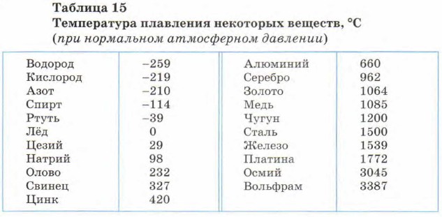 Из наблюдений следует, во-первых, что лёд начинает плавиться при определённой температуре. Важно отметить, что лёд находится в кристаллическом состоянии. Следовательно, процесс плавления кристаллических тел происходит при определённой температуре, которую называют температурой плавления. Во-вторых: температура льда и образовавшейся воды во время всего процесса плавления остаётся неизменной. Таким образом, во время процесса плавления кристаллического вещества температура вещества остаётся постоянной. 2. Лёд участвовал в теплообмене с окружающим воздухом и сосудом калориметра. Получая от них некоторое количество теплоты, лёд нагревался до температуры 0 °С, его внутренняя энергия увеличивалась за счёт увеличения средней кинетической энергии теплового движения его молекул. Затем лёд плавился, и температура его при этом не менялась, но лёд получал некоторое количество теплоты. Следовательно, его внутренняя энергия увеличивалась, но не за счёт кинетической, а за счёт потенциальной энергии взаимодействия молекул. Получаемая извне энергия расходовалась на разрушение кристаллической решётки. Процесс плавления кристаллических тел протекает аналогично рассмотренному процессу плавления льда. Чтобы расплавить твёрдое кристаллическое тело, необходимо нагреть его до температуры плавления и в дальнейшем сообщать ему энергию до тех пор, пока всё оно не превратится в жидкость. Исключение составляют те вещества, которые меняют свой химический состав или сразу превращаются в газ. Различные кристаллические вещества имеют разную температуру плавления (табл. 15).