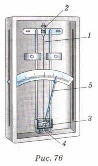 По таблице 19 можно найти температуру, при которой пар плотностью 6,84 • 10-3 кг/м3 становится насыщенным. Она равна 5 °С. Следовательно, роса выпадет при этой температуре. 5. Одним из приборов, с помощью которого измеряют влажность воздуха, является гигрометр. В основе работы волосного гигрометра лежит свойство человеческого волоса изменять свою длину при изменении влажности воздуха: он удлиняется при увеличении влажности и укорачивается при её уменьшении. На рисунке 76 изображён волосной гигрометр. В нём один конец волоса 1 прикреплён к раме 2, другой конец обёрнут вокруг ролика 3 и соединён с грузом 4. Груз держит волос в натянутом состоянии. При изменении длины волоса ролик 3 начинает вращаться и приводит в движение стрелку 5. Шкала такого гигрометра проградуирована так, что по положению стрелки можно определить относительную влажность.