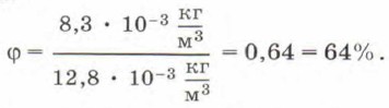 3. Рассчитаем относительную влажность воздуха, если абсолютная влажность воздуха при 15 °С равна 8,3 • 10-3 кг/м3. По таблице 19 найдём плотность насыщенного пара (ρ0) при этой температуре. Она равна 12,8 • 10-3 кг/м3. Относительная влажность в этом случае равна: