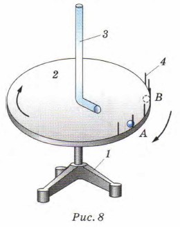 5*. Скорости движения молекул были определены экспериментально немецким учёным Отто Штерном (1888—1969) в 1920 г. Сущность опыта Штерна можно объяснить, используя модель, изображённую на рисунке 8. На подставке 1 установлен диск 2; на нём — полая изогнутая трубка 3. По краю диска укреплены спички 4. Если диск покоится, то шарик, пущенный по трубке, собьёт спичку, расположенную напротив её изогнутого конца (точка А).