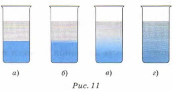 Нальём в мензурку раствор медного купороса, а сверху — воду так, чтобы между этими жидкостями была резкая граница (рис. 11, а). Через два-три дня заметим, что граница уже не будет такой резкой (рис. 11, б); через неделю она совсем размоется (рис. 11, в). Спустя месяц жидкость станет однородной и во всём сосуде будет окрашена одинаково (рис. 11, г). В этом опыте молекулы медного купороса проникают в промежутки между молекулами воды, а молекулы воды — в промежутки между молекулами медного купороса.