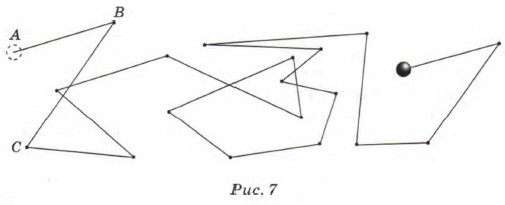 Причину движения частиц пыльцы долго не могли объяснить. Броун предположил вначале, что частицы движутся, потому что они живые. Движение частиц пытались объяснить неодинаковым нагреванием разных частей сосуда, происходящими химическими реакциями и т. д. Лишь значительно позже поняли истинную причину броуновского движения. Эта причина — движение молекул воды. Молекулы воды, в которой находится частица пыльцы, движутся и ударяются о неё. При этом с разных сторон о частицу ударяется неодинаковое число молекул, что и приводит к её перемещению. Пусть в момент времени t1 под действием ударов молекул воды частица переместилась из точки А в точку В (см. рис. 7). В следующий момент времени большее число молекул ударяется о частицу с другой стороны, и направление её движения изменяется, она перемещается из точки В в точку С. Таким образом, движение частицы пыльцы является следствием движения молекул воды, в которой пыльца находится. Подобное явление можно наблюдать, если поместить в воду частицы краски или сажи. Броуновское движение частиц можно наблюдать и в газах. 3. Выясним, каков характер движения молекул. По траектории движения частицы пыльцы (см. рис. 7) видно, что направление её движения всё время меняется. Поскольку движение частицы — следствие движения молекул воды, то можно сделать вывод, что молекулы движутся беспорядочно (хаотически). Иными словами, нельзя выделить какое-то определённое направление, в котором движутся все молекулы. Движение молекул никогда не прекращается. Можно сказать, что оно непрерывно. Итак,