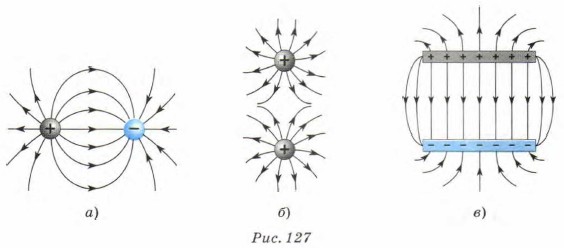 На рисунке 127 изображены линии напряжённости различных электрических полей: двух разноимённо заряженных шариков (рис. 127, а); двух одноимённо заряженных шариков (рис. 127, б); двух пластин, заряды которых противоположны по знаку и равны по модулю (рис. 127, в).