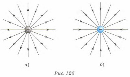 Поскольку сила, действующая со стороны электрического поля на помещённый в него заряд, имеет определённое направление, то и линии напряжённости также имеют направление. Принято считать, что линии напряжённости электрического поля начинаются на положительных зарядах, а заканчиваются на отрицательных (для одиночных зарядов линии напряжённости уходят в бесконечность). Линии напряжённости поля, созданного положительным зарядом, выглядят так, как показано на рисунке 126, а, а отрицательным — на рисунке 126, б. Линии напряжённости в первом случае направлены от заряда, а во втором — в сторону отрицательного заряда.
