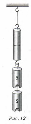 Теперь зачистим поверхности цилиндров и вновь прижмём их друг к другу. Цилиндры слипнутся (рис. 12). Они не разъединятся даже в том случае, если к нижнему цилиндру подвесить груз массой несколько килограммов. Этот результат можно объяснить так: цилиндры удерживаются вместе, поскольку между молекулами действуют силы притяжения.