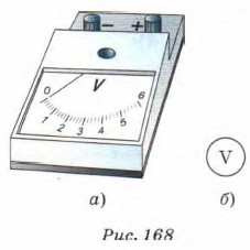 8. Прибор, с помощью которого измеряют напряжение на полюсах источника тока или на каком-либо участке цепи, называют вольтметром. Как внешний вид демонстрационного вольтметра, так и его устройство очень похожи на гальванометр и амперметр, только предназначен вольтметр для измерения напряжения. То же самое можно сказать и о лабораторном вольтметре — он похож на лабораторный амперметр (см. рис. 159, б). Поэтому для отличия вольтметра от других измерительных приборов на его шкале ставят букву V. Внешний вид и условное обозначение вольтметра на схемах показано на рисунке 168.