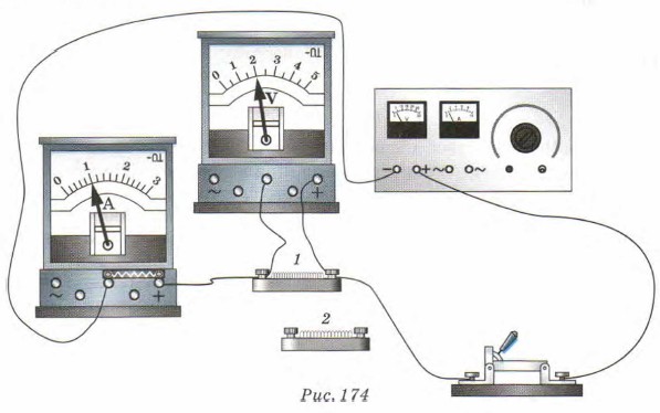 1. Напомним, что физические величины сила тока I и напряжение U характеризуют электрический ток и его действия. Установим зависимость между этими величинами. Для этого воспользуемся установкой, изображённой на рисунке 174.