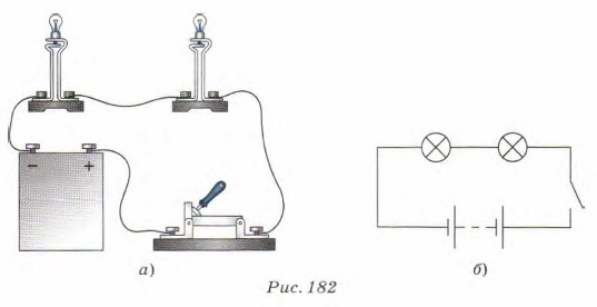 На рисунке 182, а изображена цепь из двух последовательно соединённых лампочек, а на рисунке 182, б — схема такого соединения.