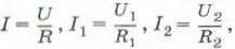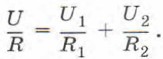 Глава 7. Электрический ток Параллельное соединение проводниковИспользуя закон Ома для участка цепи, можно получить формулу для расчёта общего сопротивления проводников, соединённых параллельно, сопротивления которых различны. Учитывая, что I = I1 + I2, а
