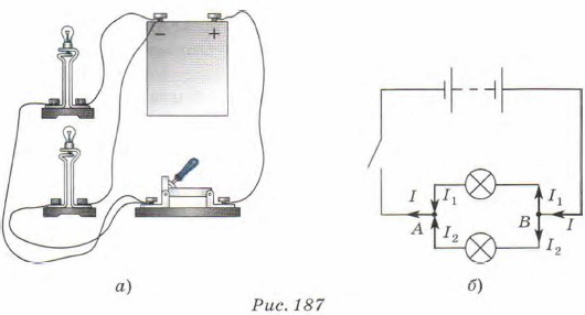 2. Если посмотреть внимательно на схему электрической цепи (см. рис. 187, б), то видно, что цепь в точке B разветвляется. Часть тока идёт в одну лампу, часть — в другую. В точке А оба тока сходятся вновь.