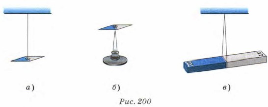 Магнитные стрелки используют для обнаружения магнитных свойств любых веществ. Если поднести к магнитной стрелке полосовой магнит (рис. 201), то можно заметить, что северный полюс стрелки будет притягиваться к южному полюсу магнита и отталкиваться от его северного полюса. Южный полюс стрелки будет отталкиваться от южного полюса магнита и притягиваться к его северному полюсу.